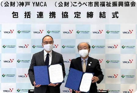 しあわせの村の自然環境を活かし、あらゆる子どもの成長支援及びそれに関わる人材育成の推進に関して相互に協力し、地域の発展に寄与することを目的として、令和3年4月に(公財)神戸YMCAと、しあわせの村を管理運営する(公財)こうべ市民福祉振興協会が包括連携協定を締結しました。