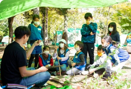 | 内容 | キャンプ体験を通して、火の起こし方やノコギリ・ナイフといった道具の使い方などを身に付けます。 参加者一人ひとりが自ら考えて行動する力を養い、自然環境に配慮する大切さに気付きます。また、幅広い年齢層の仲間や学生ボランティアとの様々な体験を通して、他人を思いやり、友好関係を築く術を養います。 |