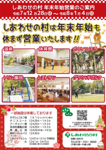 日頃は、しあわせの村をご利用いただきまして、ありがとうございます。年末年始の各施設の営業は、以下のとおりとなります。一部施設は休業させていただく日がございますので、あらかじめご了承ください。皆様のお越しをお待ちいたしております。