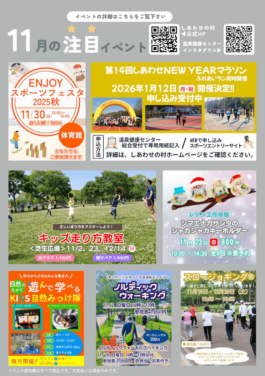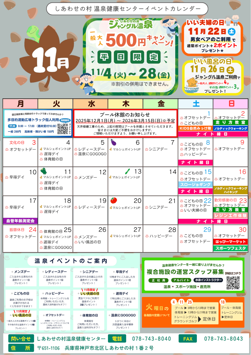 温泉健康センターイベントカレンダー 2025年11月14日お知らせ 11月 11月度ダウンロード Instagram更新中♪ イベントや教室のご案内、その他情報を発信中♪ コチラからご覧ください(*^▽^*) お問い合わせ しあわせの村温泉健康センター TEL:078-743-8040 / FAX:078-743-8043