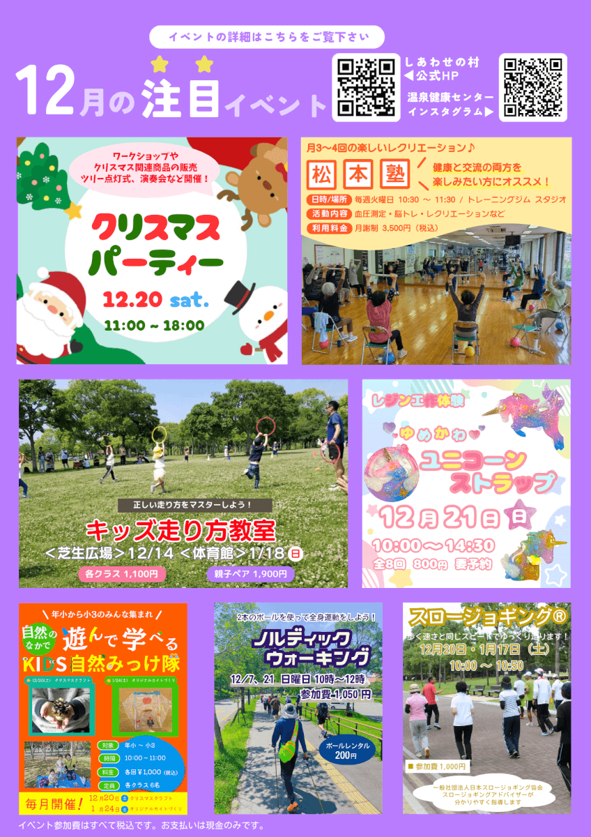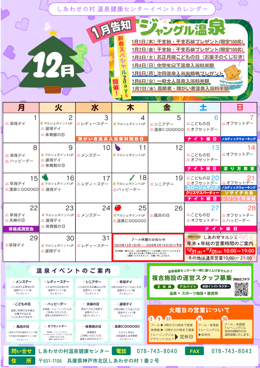 温泉健康センターイベントカレンダー 2025年12月3日お知らせ 12月 12月度ダウンロード Instagram更新中♪ イベントや教室のご案内、その他情報を発信中♪ コチラからご覧ください(*^▽^*) お問い合わせ しあわせの村温泉健康センター TEL:078-743-8040 / FAX:078-743-8043