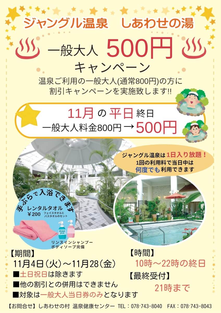 ジャングル温泉ご利用の一般大人の方は入浴料金500円でご利用いただけます。(通常800円)
