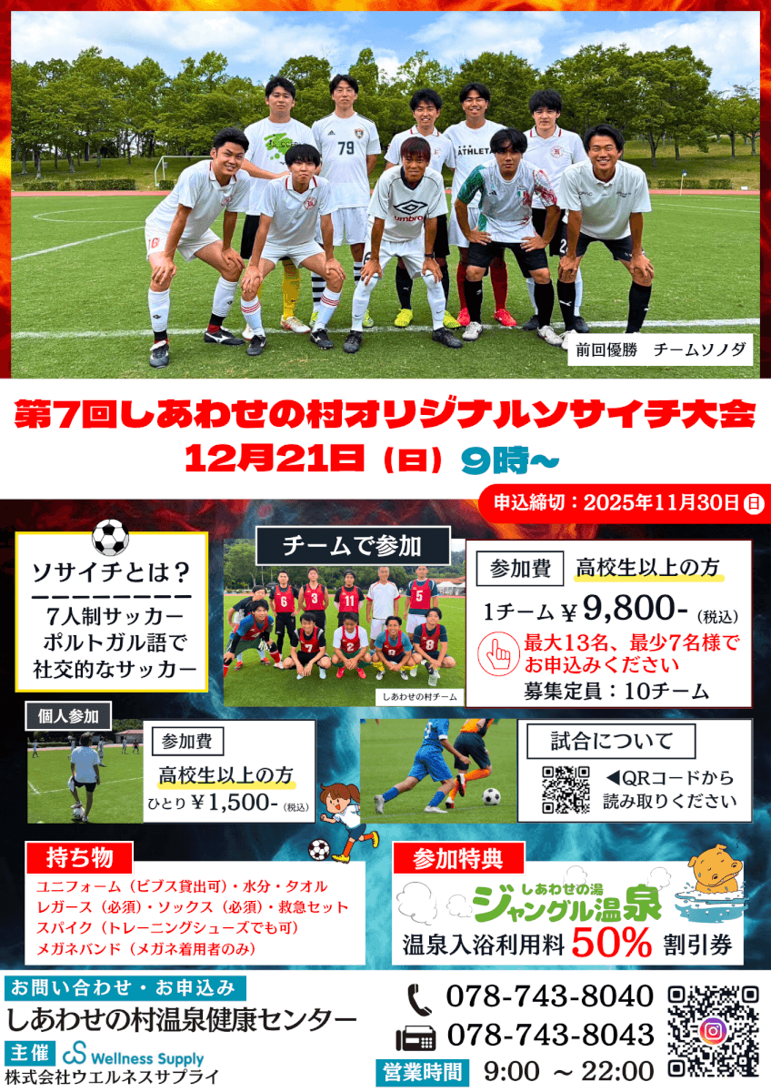 第7回しあわせの村オリジナルソサイチ大会開催! 2025年10月8日お知らせ サッカー好き集まれ! 第6回目の開催です! 初心者の方でも大歓迎!みんなでサッカーを楽しみましょう! 第6回目に出場してくださった皆さん ルールについて 下記からご確認ください。 第7回大会概要ダウンロード 申込方法 電話もしくはしあわせの村温泉健康センターフロントにて直接申し込み ※事前支払い(現金のみ) 申込期限:11月30日(日) 規約をお読みになってからお申込みください。 お問合せ先 しあわせの村温泉健康センターTEL:078-743-8040 / FAX:078-743-8043