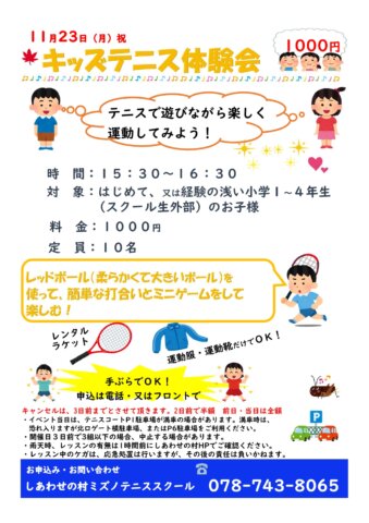 しあわせの村ミズノテニススクール 078-743-8065までお願いいたします。