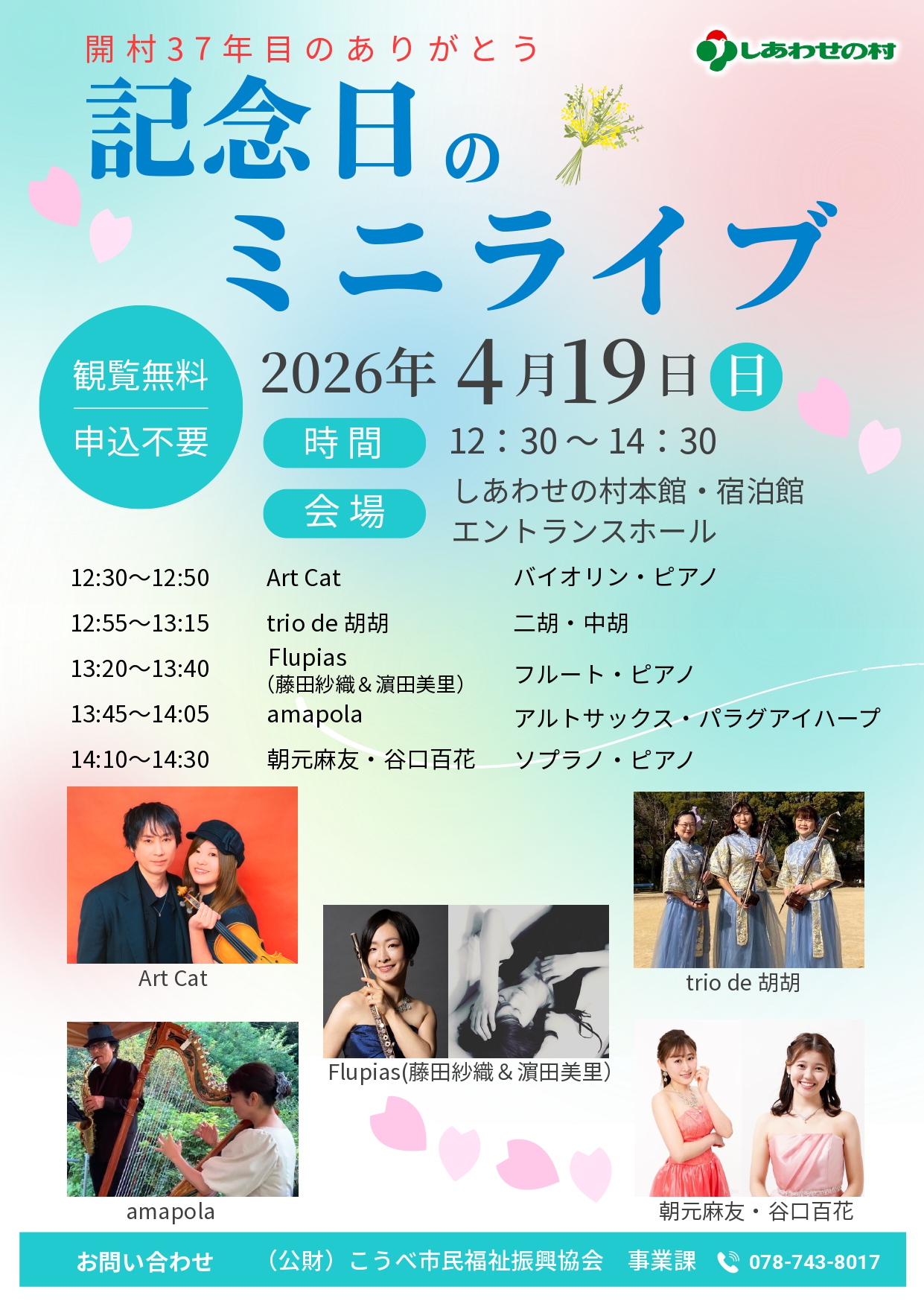 しあわせの村は、1989年4月23日に開村して以来、今年で37年を迎えます。これまでの感謝の気持ちと、これからも皆さまに愛されるしあわせの村であり続けたいという想いもこめて、生演奏のミニライブを開催します。子どもから大人まで楽しめる曲目をお届けします。花と緑あふれる春の風景と共に、素敵な1日を過ごしてみませんか。