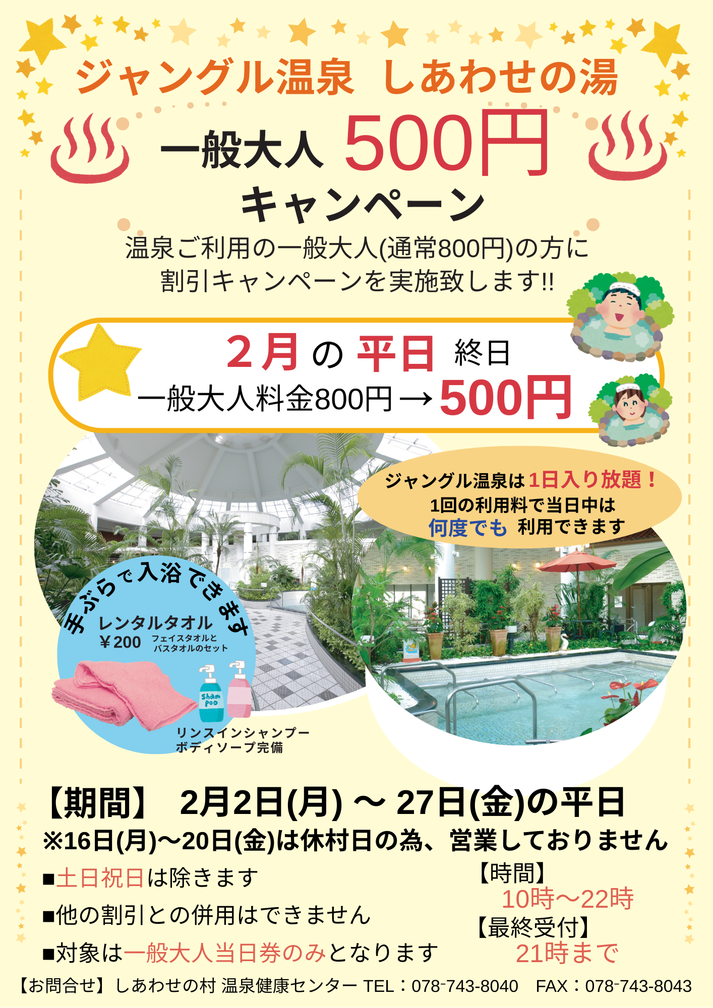 2月の平日限定で、一般大人の方の入浴料が通常800円のところ500円でご利用いただけます。
