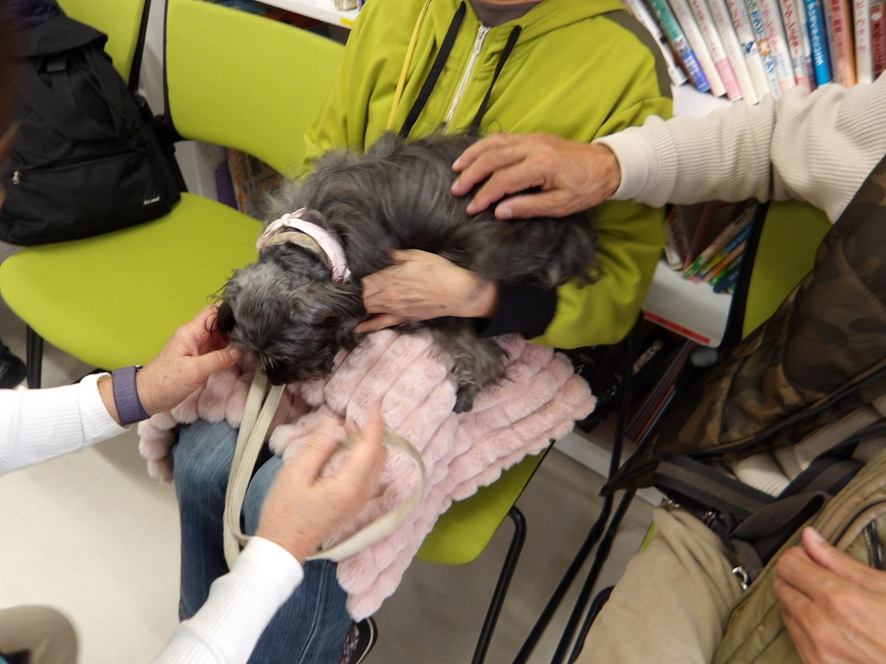 犬を飼いたいけれどいろいろな事情で飼えない、というシニアの方たちに犬と一緒に過ごす時間を持っていただくことで、参加者同士の交流や会話が弾む等、皆さんに楽しんでいただくプログラムです。お天気が良ければ一緒に外をお散歩したりもします。(※65歳以上の方限定のプログラムです)