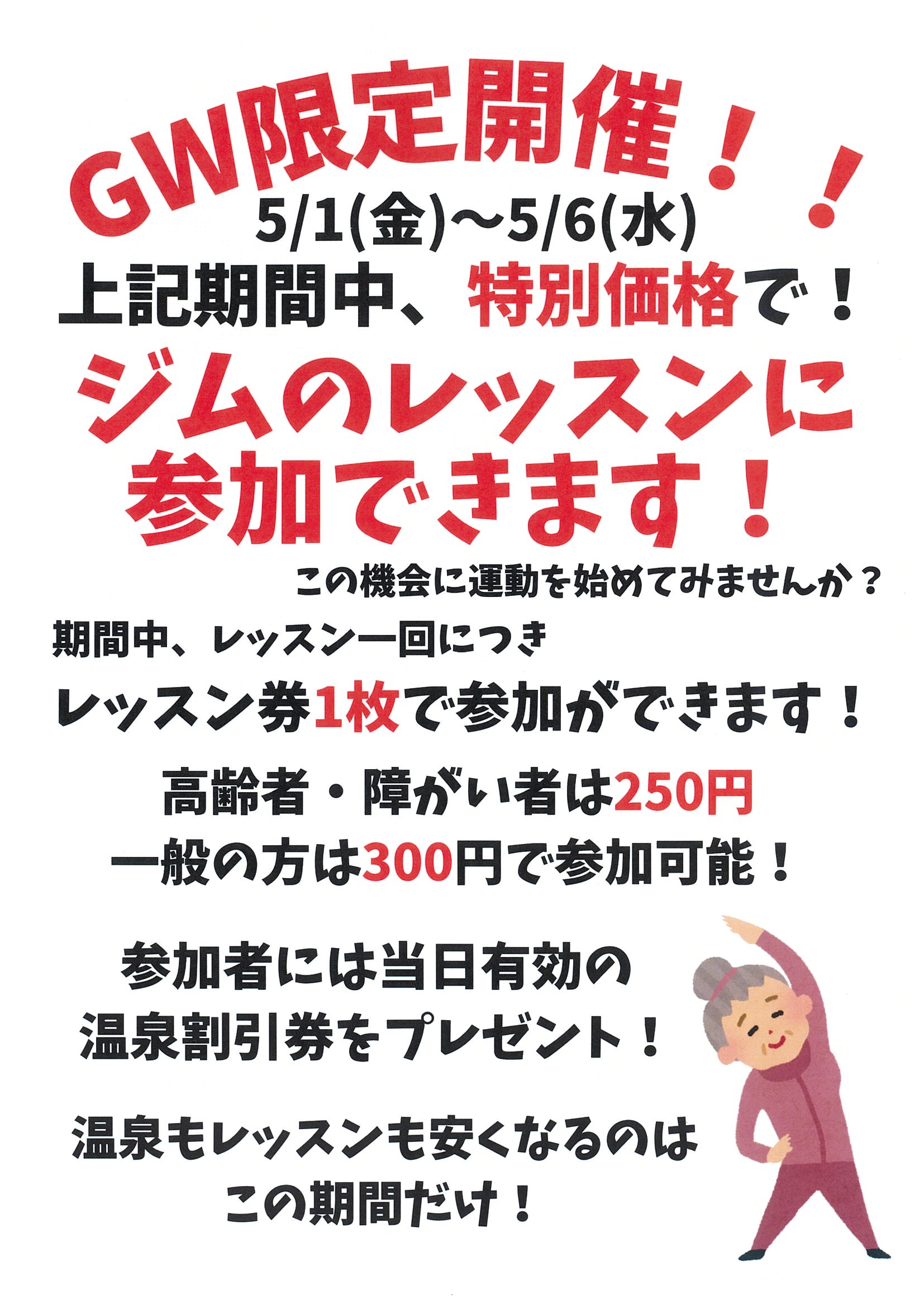 温泉もレッスンも安くなるのはこの期間だけ!