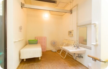 シャワーは車いすのままで、全身(背中・腕・足)が一度に流せます。また、着替え用ベッドやトイレも設置してあり、ゆったりと介護ができます。