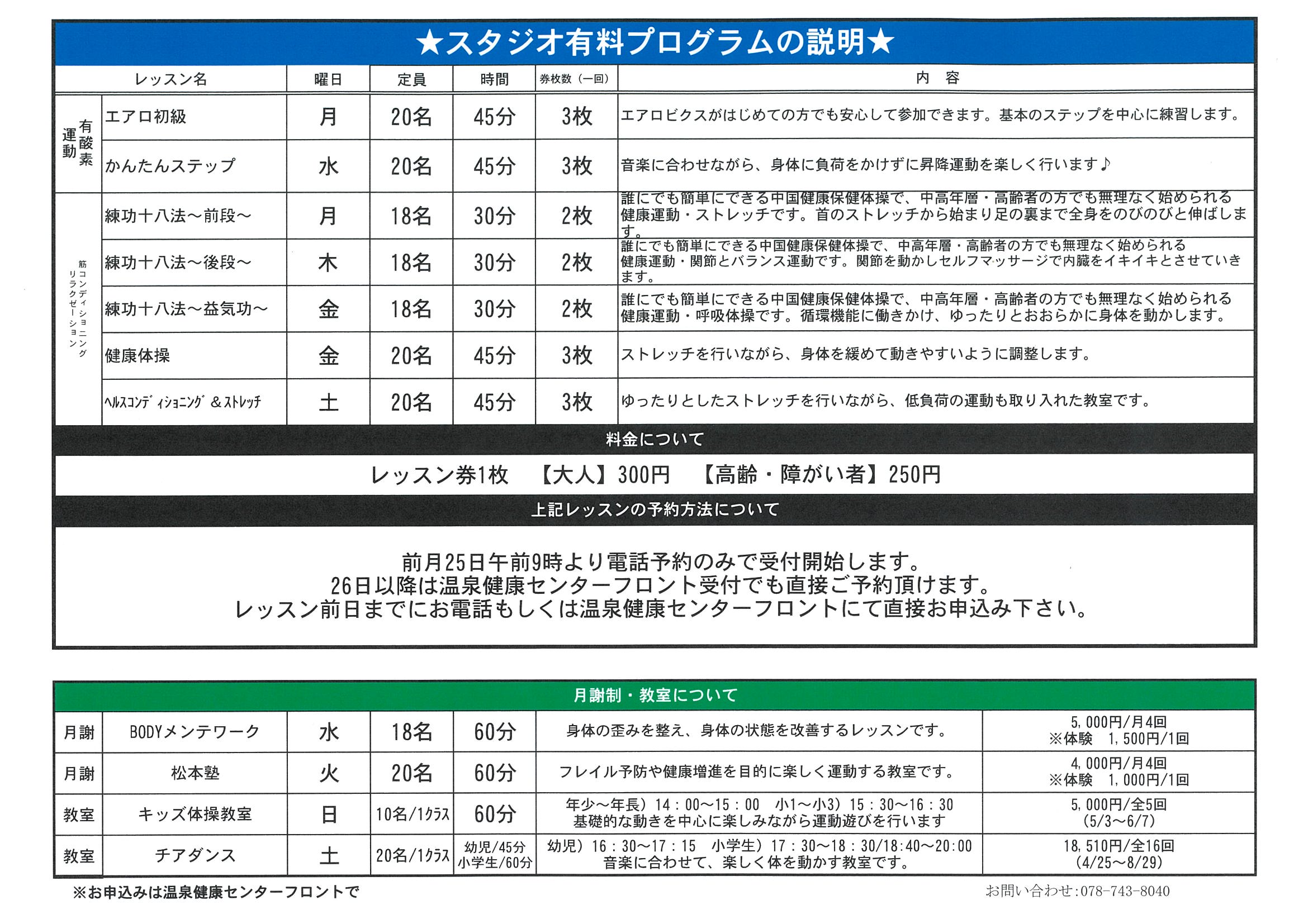 ※レッスン前日までにお電話もしくは温泉健康センターフロントにて直接お申込みください。