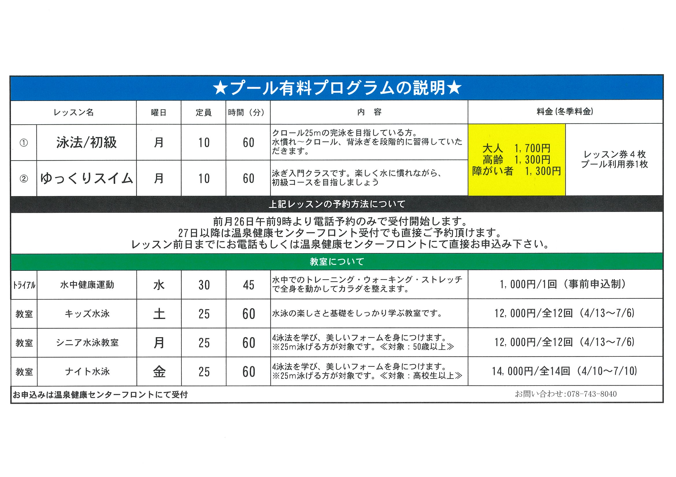 ※レッスン前日までにお電話もしくは温泉健康センターフロントにて直接お申込みください