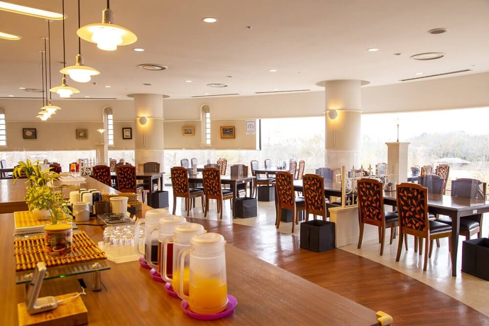 大きな窓からご覧いただける四季折々の景色と共に自然の恵みを感じながらお食事をしていただけるレストラン。