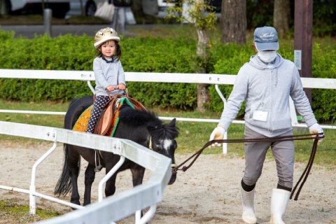 ポニーに乗りお散歩する子ども